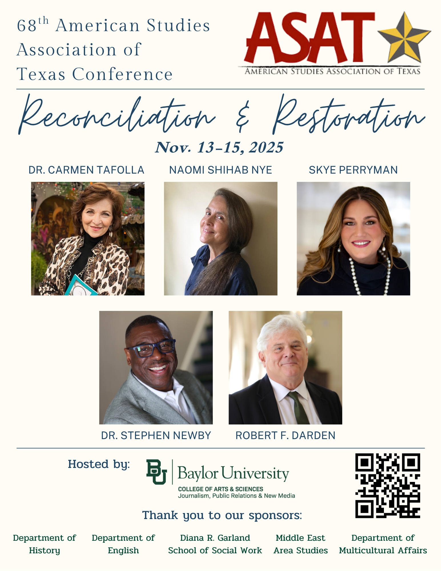 We’ll be excited to see abstract proposals that interpret this year’s theme from an American Studies perspective. We’d like prospective presenters to write abstracts that examine the complex relationship between Reconciliation & Restoration, but we’ll also consider presentations dealing with issues relating to American culture, especially ones that focus on Texas, the South – or the Southwest.